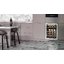 Встраиваемые холодильники для вина оснащаются специальной системой вентиляции: охлаждающая система у них находится в нижней части корпуса спереди. На такие устройства не навешивается мебельный фасад: дверца с затемненным стеклом остается на виду и открывается на достаточно широкий угол для свободного выдвижения деревянных полок.