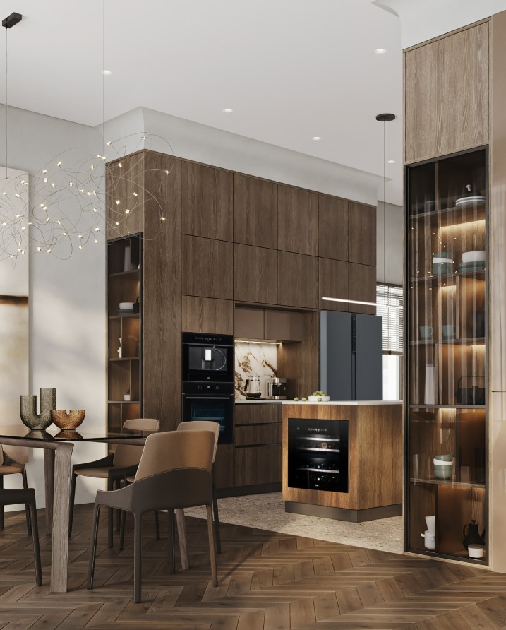 Встраиваемые холодильники для вина оснащаются специальной системой вентиляции: охлаждающая система у них находится в нижней части корпуса спереди. На такие устройства не навешивается мебельный фасад: дверца с затемненным стеклом остается на виду и открывается на достаточно широкий угол для свободного выдвижения деревянных полок.