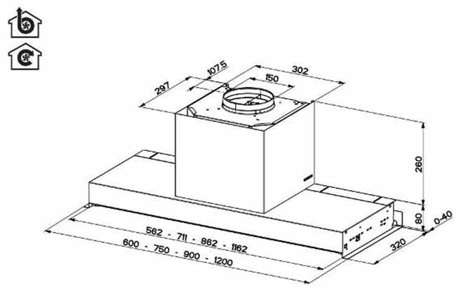 У многих встраиваемых моделей глубина может регулироваться, а рабочая всасывающая поверхность — увеличиваться благодаря выдвижному козырьку, но габариты корпуса такой вытяжки должны соответствовать размерам подвесного шкафа. Выбирать основные размеры вытяжки с соблюдением всех требований эффективности и безопасности работы следует также не в ущерб общему дизайну помещения.
