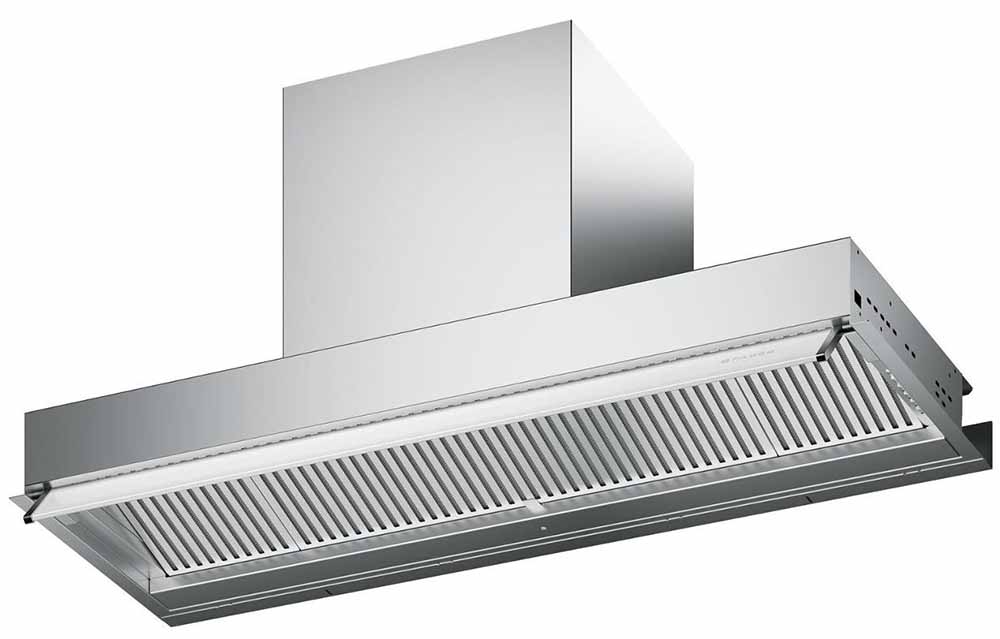 Вытяжка, встраиваемая в потолок, часто устанавливается над кухонным островом в просторной кухне и отличается достаточно высокой мощностью: она может работать как в режиме рециркуляции, так и в режиме отвода, так как воздуховод также скрыт в потолке. Вытяжки могут монтироваться в подвесной потолок либо устанавливаться в специальные многоярусные конструкции из гипсокартона непосредственно во время ремонта кухни. Для управления ими используется пульт ДУ.
