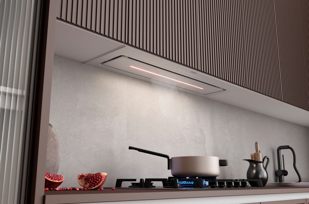 Вытяжки, встраиваемые в столешницу — эффективная инновация, которая подойдет для установки в кухне любой площади. Такие вытяжки размещаются за варочной поверхностью или рядом с ней. В отключенном состоянии всасывающая панель находится под столешницей, но после включения одной или нескольких конфорок она автоматически выдвигается при помощи специального лифтового механизма. Загрязненный воздух улавливается, не успевая распространиться по помещению. Когда вытяжка убрана, на виду остается только сенсорная панель управления. Недостатком подобных моделей является только сравнительно высокая цена.
