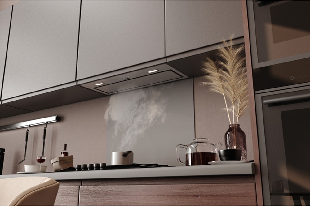 Вытяжки, встраиваемые в столешницу — эффективная инновация, которая подойдет для установки в кухне любой площади. Такие вытяжки размещаются за варочной поверхностью или рядом с ней. В отключенном состоянии всасывающая панель находится под столешницей, но после включения одной или нескольких конфорок она автоматически выдвигается при помощи специального лифтового механизма. Загрязненный воздух улавливается, не успевая распространиться по помещению. Когда вытяжка убрана, на виду остается только сенсорная панель управления. Недостатком подобных моделей является только сравнительно высокая цена.