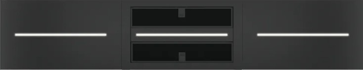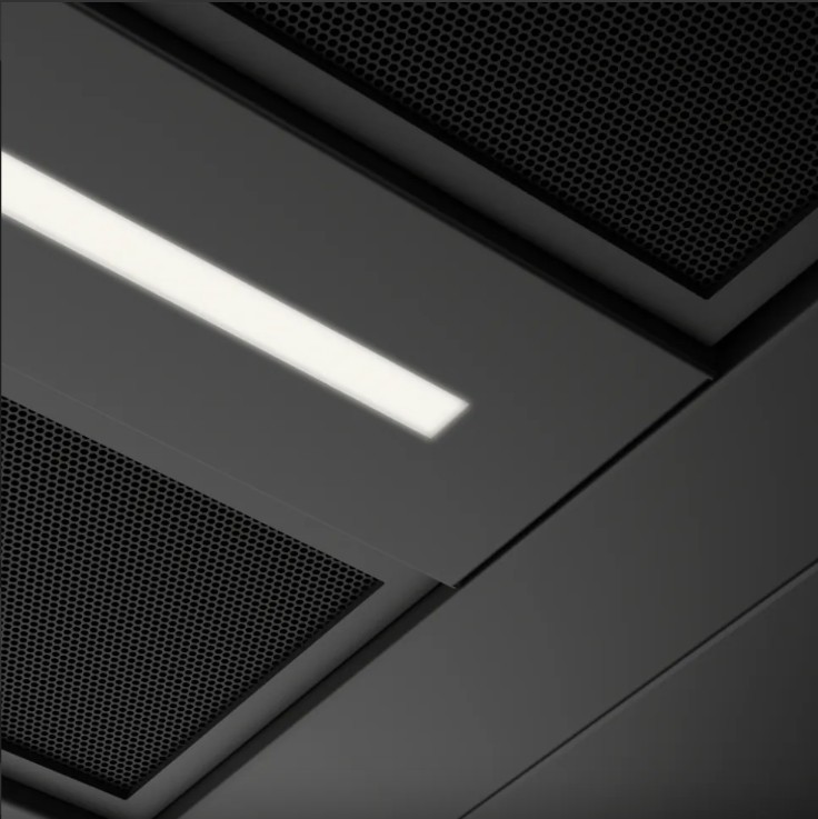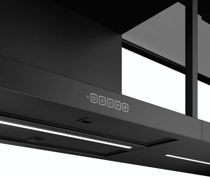 Воздух всасывается по периметру вытяжки через узкие щели. Он собирается в потоки, которые направляются прямо к фильтрам внутри, не рассеивается на кухне. Благодаря этой технологией вытяжку можно сделать компактнее и энергоэффективнее.