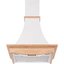 Особенно разнообразен ассортимент классических вытяжек с окантовкой из натурального дерева. Корпус таких моделей выполняется в спокойном белом или бежевом цвете, хорошо сочетающемся с оттенками натурального дерева — мореного дуба, бука, вишни или ореха. Нередко для окантовки используется окрашенное дерево в тон с цветом купола: особенно популярны оттенки ванили, бежевый и кремовый. Иногда дерево специально оставляют неокрашенным, чтобы пользователь мог подобрать оттенок самостоятельно.