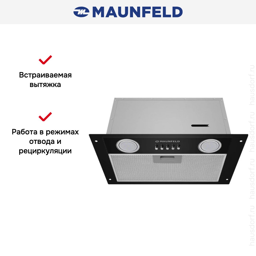 Встраиваемая вытяжка — выбор тех, кто хочет максимально задекорировать технику, или владельцев маленькой кухни. Тип встраивания: в шкаф. Обратите внимание на цветовые сочетания модели Maunfeld Cam 45 Black, чтобы органично вписать ее в свою квартиру. Оттенок корпуса: черный.