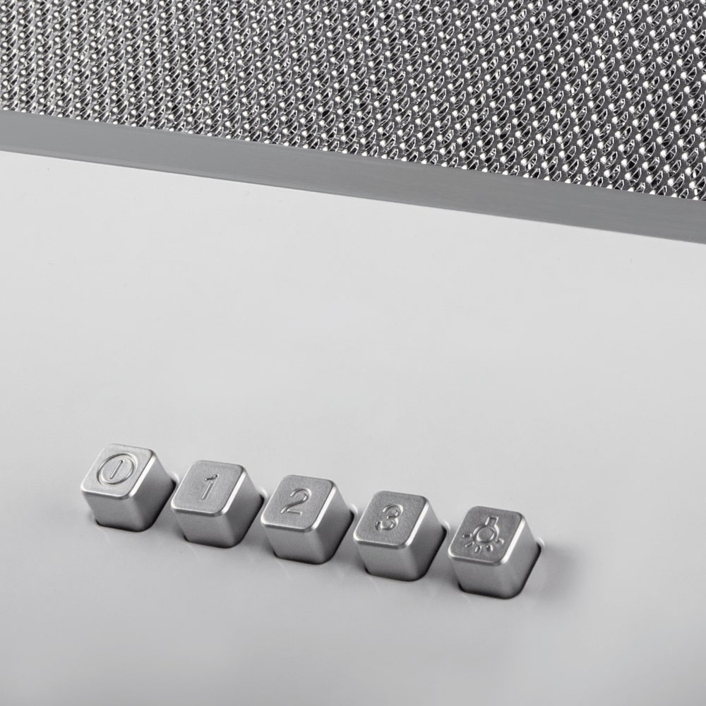 Наиболее распространенным элементом управления являются кнопки — ими оснащаются устройства с механическим управлением. Кнопки можно увидеть у вытяжек всех типов, от простых встраиваемых до дизайнерских подвесных, островных или наклонных. Количество кнопок зависит от набора функций: в простейшем случае достаточно всего трех кнопок — двух для переключения скоростей и одной для включения освещения. Как правило, они имеют круглую форму, однако производители предлагают устройства с квадратными и даже треугольными кнопками. В больших купольных вытяжках кнопки могут изготавливаться из меди, бронзы или латуни, а моделях современного дизайна — оснащаться подсветкой.