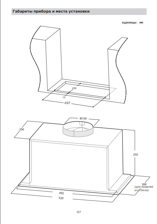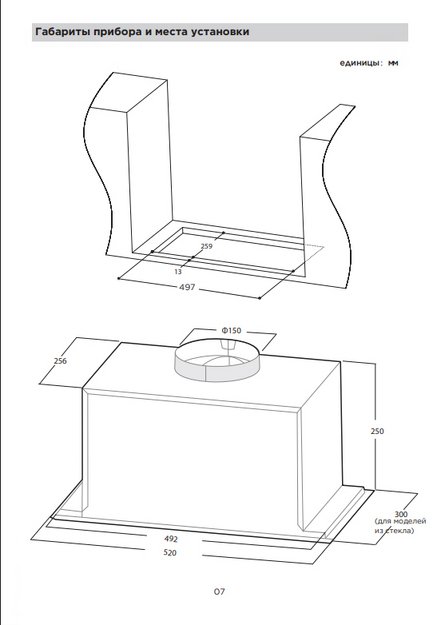 У многих встраиваемых моделей глубина может регулироваться, а рабочая всасывающая поверхность — увеличиваться благодаря выдвижному козырьку, но габариты корпуса такой вытяжки должны соответствовать размерам подвесного шкафа. Выбирать основные размеры вытяжки с соблюдением всех требований эффективности и безопасности работы следует также не в ущерб общему дизайну помещения.