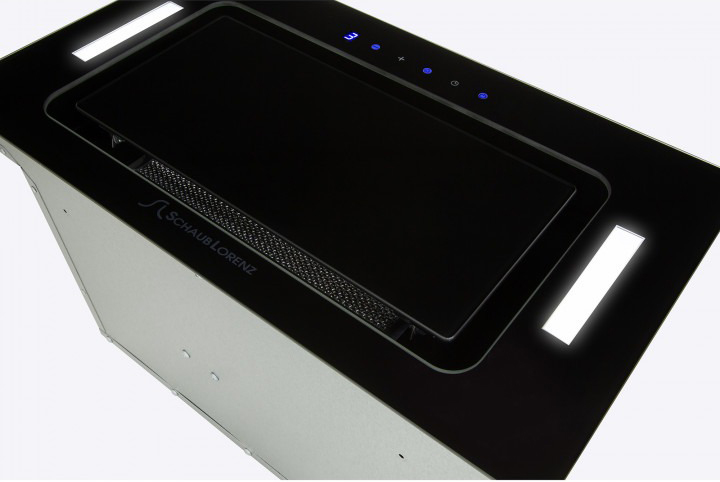 Вытяжки, встраиваемые в столешницу — эффективная инновация, которая подойдет для установки в кухне любой площади. Такие вытяжки размещаются за варочной поверхностью или рядом с ней. В отключенном состоянии всасывающая панель находится под столешницей, но после включения одной или нескольких конфорок она автоматически выдвигается при помощи специального лифтового механизма. Загрязненный воздух улавливается, не успевая распространиться по помещению. Когда вытяжка убрана, на виду остается только сенсорная панель управления. Недостатком подобных моделей является только сравнительно высокая цена.