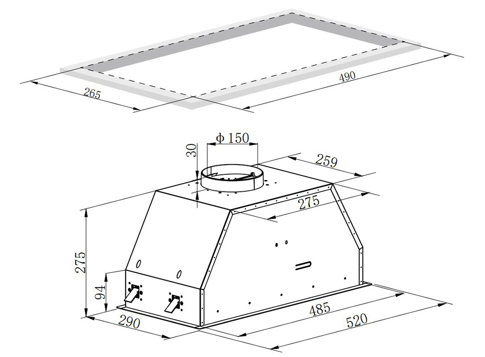 У многих встраиваемых моделей глубина может регулироваться, а рабочая всасывающая поверхность — увеличиваться благодаря выдвижному козырьку, но габариты корпуса такой вытяжки должны соответствовать размерам подвесного шкафа. Выбирать основные размеры вытяжки с соблюдением всех требований эффективности и безопасности работы следует также не в ущерб общему дизайну помещения.