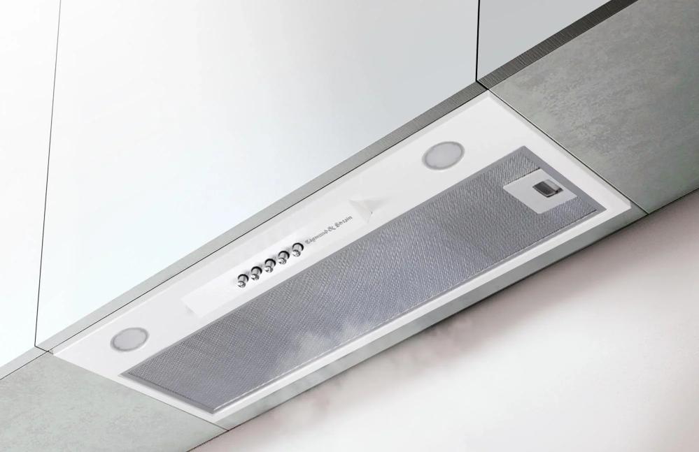 Встраивание вытяжки в шкаф — оптимальный вариант для малогабаритной кухни. Такие модели просты в установке, недороги, практически скрыты от глаз, их не нужно подбирать по внешнему виду, а также чем-то маскировать воздуховод. Уровень шума также снижается благодаря дополнительной звукоизоляции. Встроенные в шкаф модели могут дополняться выдвижной панелью, которая увеличивает площадь забора загрязненного воздуха. Иногда к встраиваемым относят также вытяжки, которые монтируются под подвесной шкаф, хотя их корпус остается на виду.