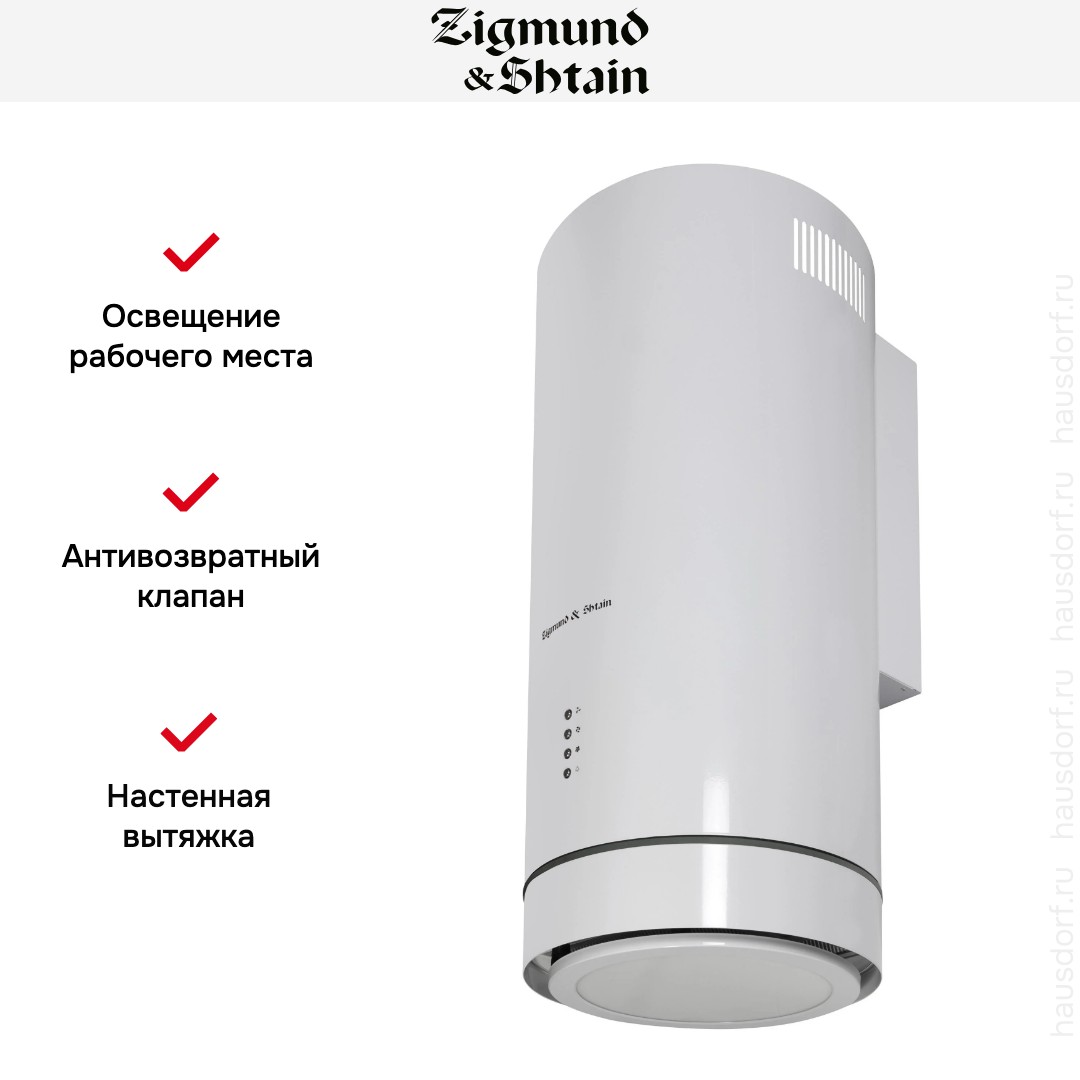 Крепление вытяжки к стене — стандартное для многих моделей, ими удобно управлять, так как кнопки находятся на расстоянии вытянутой руки. Обратите внимание на цветовые сочетания модели Zigmund Shtain K 013.4 W, чтобы органично вписать ее в свою квартиру. Оттенок корпуса: белый. Благодаря лампочкам, которые расположены на нем, можно освещать плиту и столешницу рядом, чтобы готовить было еще проще и приятнее.